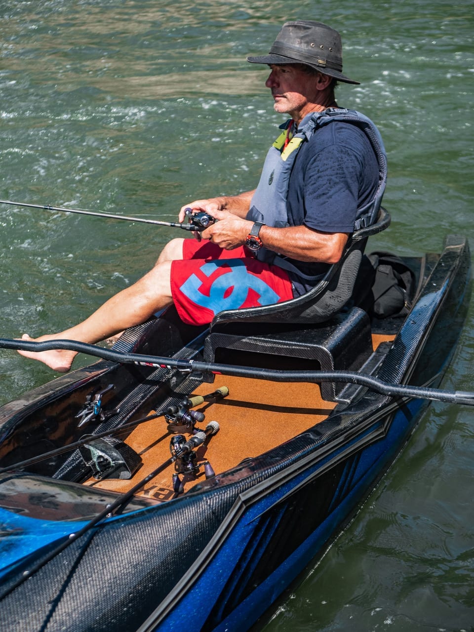 Overcome by the desire for a lightweight, high-performance fishing kayak, EJ decided it was time to assemble a party of experts and enthusiasts to make it a reality. Paddle powered, fast, nimble, versatile. The ingredients list is: Carbon Fiber, Epoxy, Innegra, foam core, cork, super magnets, and the ultimate paint job to finish the package. The craftsmanship that is included in this kayak is by individuals with a passion for what they do, and a track record of doing it like nobody else, and doing it with their own two hands. Hull design by Bob Blair to EJ’s specs of low draft, stable, fast, and maneuverable. Seat design by Mark Nordstrom/EJ, and inspired by race cars, Olympic racing seats in kayaks (EJ has a lot of experience with those), Plug shaping by Pat Keller, whitewater kayak designer and athlete. Production plug and mold finishing by Russ Emanis, advanced composites Guru. You will want to spend more time on the water with this kayak than ever before.