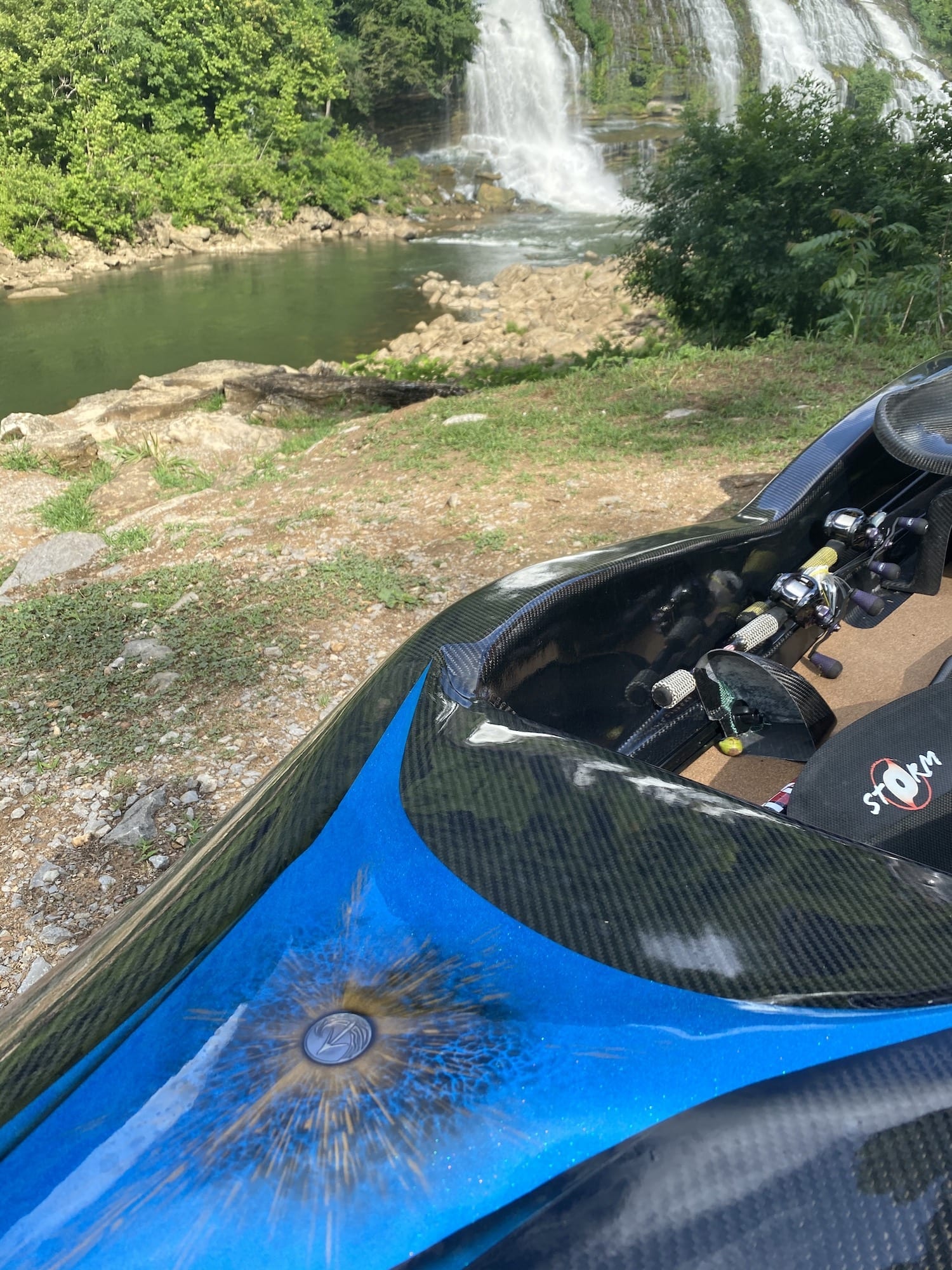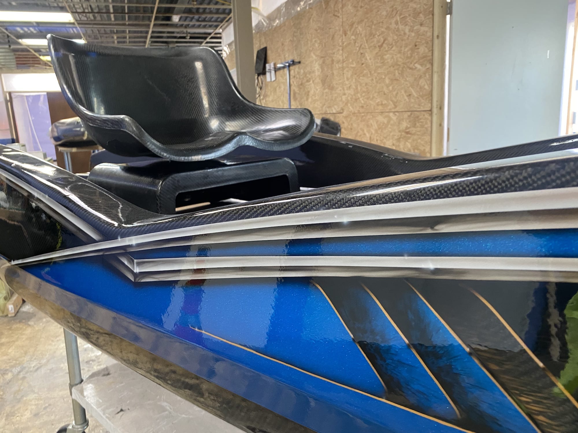 The Tyr represents our first vision of the evolved fishing kayak realized in carbon fiber form. Function determines the form is our rule, and after careful consideration of the performance we desired, this is what the boat looks like. Simple elegance describes it best. Those who have experienced it agree. The piercing bow is based on the latest boat design technology, also employed in racing SUPs. The high volume bow keeps the boat on the surface and sheds water when piercing waves. The hull is extremely low draft and planing, so very little water is needed to float it. The hull is clean and offers unparalleled stability while moving fast and quietly over the water. It skims, glides, and nearly hovers. The side profile is a smooth double “S” shape that flows neatly for an attractive aesthetic, but the real purpose is to provide a clear space for your hands while paddling, yet providing enough deck volume and sidewall for paddling performance, rod storage and wave protection. The natural Amorim Cork Decking is elegant. It dampens noise, offers traction for standing, and pads your rod and reels. We created the Tyr tackle bag specifically to carry enough gear for the day, but not too much. It is custom-designed, cut and sewn by Marcus Nelson Denim in Knoxville, TN. Pair the bag with the boat and you really have a package to be proud of. It would be difficult to miss the amazing stock paint job on each boat. Multi-staged, clear coat, colors, air brush, pin stripes, and metal flake provide protection to the epoxy and carbon while giving you a piece of art to admire. Our painter has been dressing up some of the world’s most high-end show cars and motorcycles over the years and his skills are legendary. The Stock paint scheme on each Tyr showcases the depth of the carbon, while adding some color, sparkle, and accentuating the shape of the boat. No need to stop there as custom paint jobs are also available to personalize your boat to your specs. Call for a quote.